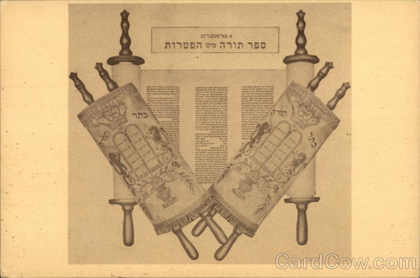 Front: COP תורה GIE ALLE כתר REFE HUP H Thain un 23 75 א פאלטטעגרינע ספר תורה מיט הפטרות IS 14 VAMEA GATES 200 SAR - AA/AAA Ha קליט. תורה SHOE 2. כתר T Back: SCROLLS OF THE LAW Published by TULANE-Box 78, Station H- New York 25 Maximart Card