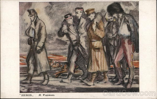 Front: ⁹⁹ HEROS,. M. Wagemans. T Back: Imprimé par GEO. W JONES à l'Enseigne du Dauphin, 12-14 Gough Square, Londres, E.C. Vente au profit des Asiles des Soldats Invalides Belges. CARTE POSTALE. 2.00 Côté reservé à l'adresse.