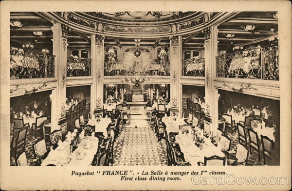 Front: CA Paquebot "FRANCE". La Salle à manger des 1" classes. First class dining room. 24 Back: Lévy et Neurdein réunis. - 44, Rue Letellier, Paris. Édition Spéciale de la Cie Gle Transatlantique (French Line) ADRESSE