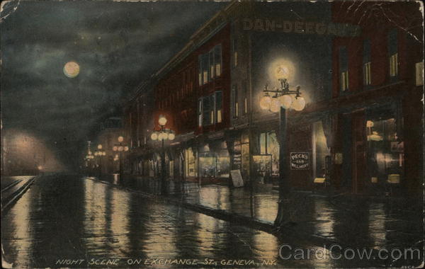 NIGHT SCENE ON EXCHANGE ST., GENEVA, NY.
