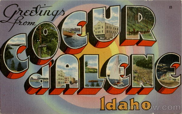 Front: Precting's 13 ECSO 1daho Back: "TICHNOR QUALITY VIEWS" REG. U. S. PAT. OFF. MADE ONLY BY TICHNOR BROS., INC., BOSTON, MASS. 75415 PUBLISHED BY WOODCOCK'S DRUG STORES, COEUR D'ALENE, IDAHO