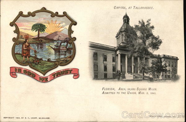 Front: IN GOD WE COPYRIGHT 1906, BY E. C. KROPP, MILWAUKEE. CAPITOL, AT TALLAHASSEE. FLORIDA, AREA, 58,680 SQUARE MILES, ADMITTED TO THE UNION, MAR. 3, 1845. ww 111 EDUCATIONAL SERIES, NO. 2716 Back: Post Gard E C KROPP COMPANY #5 400 TWO CENTS