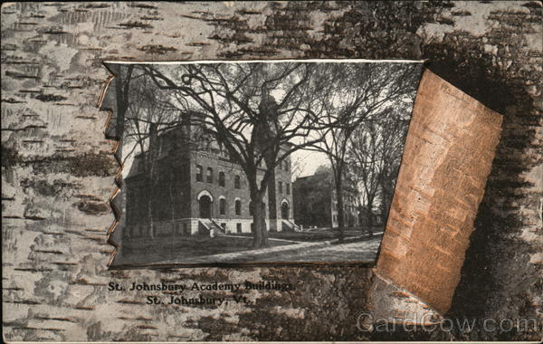 Front: IN St. Johnsbury Academy Buildings St. Johnsbury, Back: Co Message allowed in this space for one cent postage. 50 This space is exclusively for the address Paura M. Crage. Lyndon's Vermont J