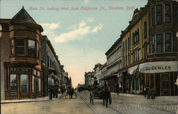 Front: ABC' BEER Main Str. looking West from California Str., Stockton, Calif. 10 in J.KUECHLER Back: No. 3050 Publ. by International Post Card Co., New York. 1. Made in Germany. POST CARD
