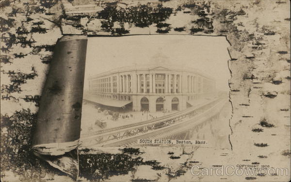 Front: 11 T娘,好 DONE SOUTH STATION, Boston, Mass. tr COPYRIGHT 1906 BY C. M. NELSON Back: 4- 13 R.R.. STA Stamp Here