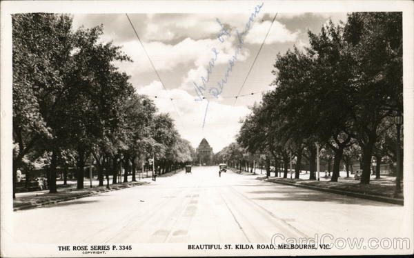 Front: 10 THE ROSE SERIES P. 3345 COPYRIGHT. he BEAUTIFUL ST. KILDA ROAD, MELBOURNE, VIC. Back: Published by the Rose Stereograph Co. Armoddle, Victoria. The "Rose" Series De Luxe A Real Photograph Produced in Austraile