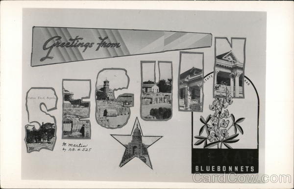 Front: Greetings from Cotton Yard, Seguin, M. Martin by AB- #525 XAS 15 BLUEBONNETS Back: --Kodak- Paper. 1