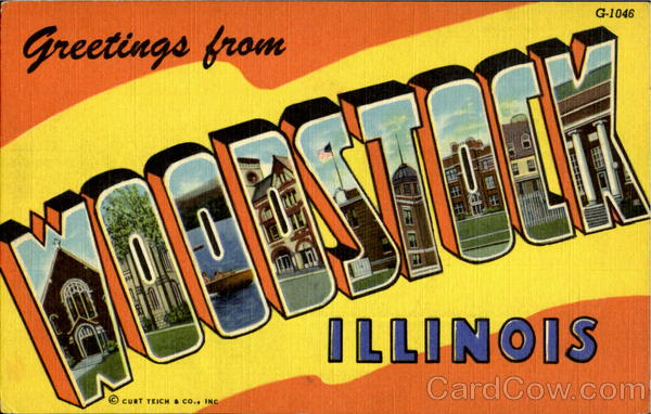Front: G-1046 Greetings from ILLINOIS © CURT TEICH & CO., INC Back: AERO DISTRIBUTING CO., INC., CHICAGO, ILLINOIS SELECTED VIEWS OF WOODSTOCK, ILLINOIS OC-H1777