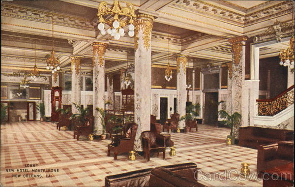 Front: LOBBY NEW HOTEL MONTELEONE NEW ORLEANS, LA. WH as a Back: C. B. Mason, Publisher, 134 Royal St., New Orleans No. 43. 100 FOREIGN