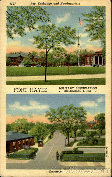 Front: A-37 Post Exchange and Headquarters FORT HAYES MILITARY RESERVATION COLUMBUS, OHIO Entrance 9A-H2096 Back: W. E. AYRES, 1049 LIVINGSTON AVE., COLUMBUS, OHIO
