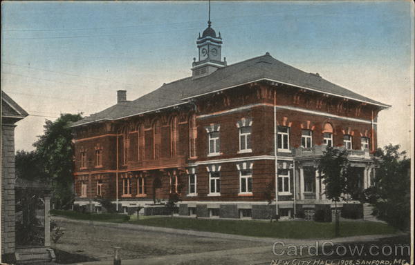 Front: RE If II HE EA NEW CITY HALL 1908. SANFORD, ME Back: Published by F. C. Philpot, Photographer, Sanford, Me. This Space is Exclusively for the Address Received this card from you friend. Lia Fournier, 5-