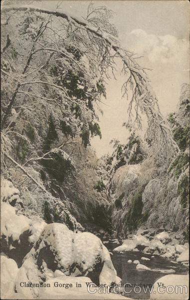 Front: Clarendon Gorge in Winter, Southwestern, Vt. 1920 Back: Published by Green Mountain Card Co., White River Junction Vt. 23. Nature Paintings series. GMCCO -BE 6-84 20