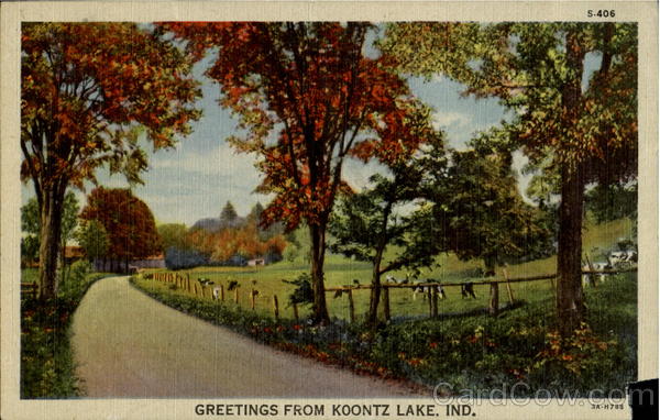 Front: S-406 GREETINGS FROM KOONTZ LAKE. IND. 3A-H788 Back: C. T. RURAL SCENES-10 SUBJECTS U.S. PAT.OFF.) ONL CEN PLACL