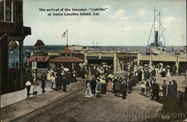 Front: ***!!! Ilvel) The arrival of the Steamer "Cabrillo" at Santa Catalina Island, Cal. wwww 255 aduatio MESS BANG Back: Mfg. by Tichnor Bros. Inc., Boston, Mass. & Los Angeles, Cal. For Correspondence only OST ARD 20
