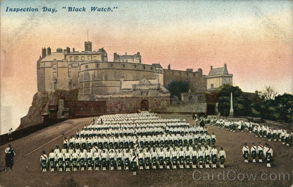 Front: Inspection Dag, "Black Watch." In Tu lalu tn 1.1 GA PARLARES 1313 ALOHA RXX A Back: BRITISH MANUFACTURE. P. & W. M., Ltd. P.W. POST VELLO CARD. MARK M. LD BUT NOT WHEN SENT ABROAD. Affix d. Stamp id. Stamp Foreign.