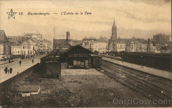 Front: 42. Blankenberghe. - - C'Entrée de la Gare KUWAK GRAND HOTEL OES FLA GARAGE ROYAL PALE -BUFFE NORD ANGE FALL SILIER PE Back: Roland, édit., 14. r. des Boulangers, Blankenberghe 8/24 J Goodmanl