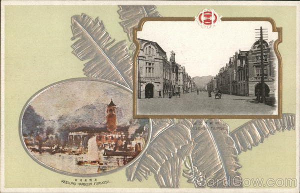 Front: 台湾基隆港 KEELUNG HARBOUR FORMOSA. 20 台北府前街 FUZENGA TAIPER. 醃料: Back: TAIPEH BRANCH OFFICE Japan Tourist Bureau Taiwan Railway Hotel Building. Tel. Nos. 556, 562, 563. PRINTED BY TOPPAN PRINTING COMPANY
