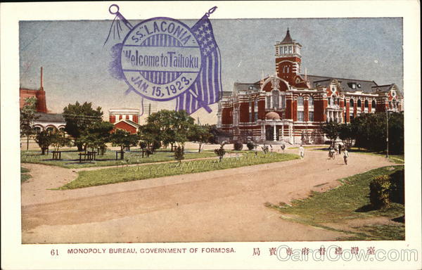 Front: SS. AC ONIA Welcome to Taihoku 15.1923. JAN. 可用 10 61 MONOPOLY BUREAU, GOVERNMENT OF FORMOSA. 局賣專府督總灣 Back: TOKYO DESIGN PRINTING 6. 烏干 桶簡錄堂 KANDA TOKYO 是男生源社 行發堂高新 北