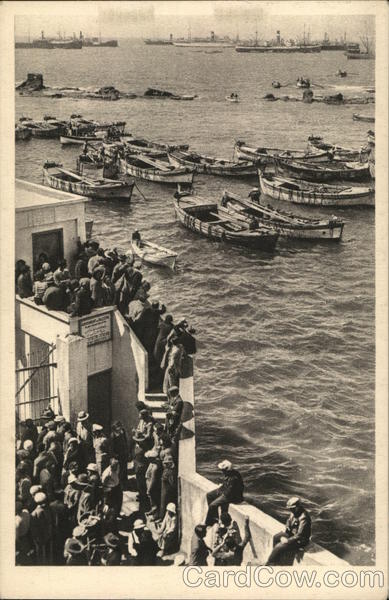 עלית החלוצים ביפו CHALUTZIM LANDING AT JAFFA Photo: J. Benor-Kalter Published & Copyright by S. Adler, Haifa, P. O. B. 960, Hadar Hacarmel, Palestine Nr. 801 in Austria