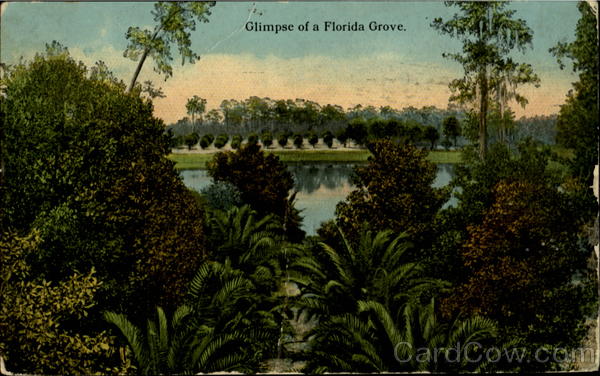 Front: Glimpse of a Florida Grove. Back: TAME Jacksonville Fla. FLA OST CARD FOR CORRESPONDENCE ONLY 1758 This is the Plage weather. FLORIDA ARTISTIC Rockland Louise. Manachusetts A-31099