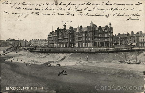 Front: る ma w mo Luw fom lutie rucl - Shud am nor Lanin. BLACKPOOL.NORTH SHORE. Back: POSTS QUE ole -1 8-AM 19 CONR Communication bere ONE PENNY hiss Flora & Schuldier cre it SA Danlay Com