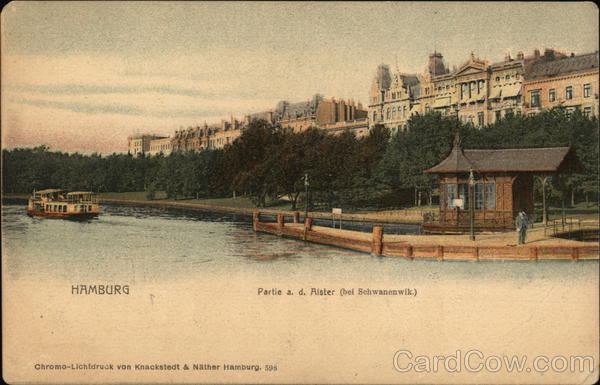 Front: FF ILECE HAMBURG Partie a. d. Alster (bei Schwanenwik.) Chromo-Lichtdruck von Knackstedt & Näther Hamburg. 598 Back: -- -- POSTKARTE. --
