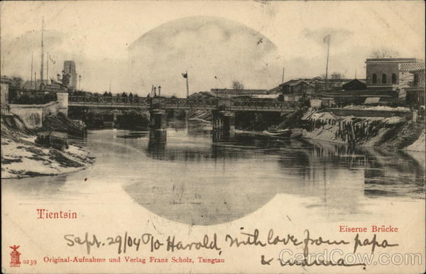 Front: 1区区KS Tientsin Eiserne Brücke 0239 Original-Aufnahme und Verlag Franz Scholz, Taine hlave on papo kmivu a 31253 Back: 7" Poſtkarte. To Harold Eelrich Komple Hill Chefaro Maintena