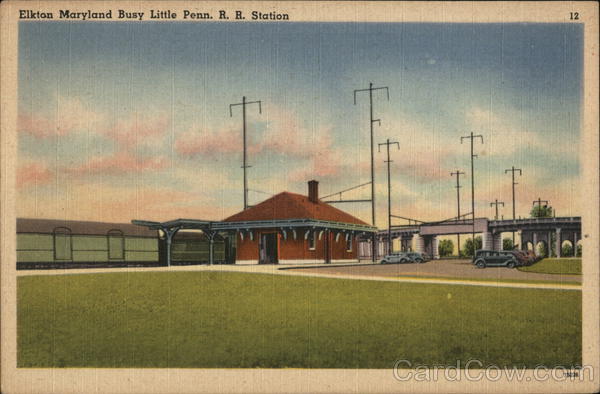 Front: Elkton Maryland Busy Little Penn. R. R. Station 12 ta 75026 Back: MADE IN U, S. A PUB. BY DEL MAR NEWS AGENCY. WILMINGTON, DEL. 6. que