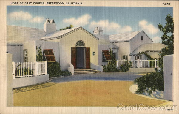 Front: HOME OF GARY COOPER, BRENTWOOD, CALIFORNIA T-357 62678 Back: 6 6 POSTARD tichnor art company, L. A.