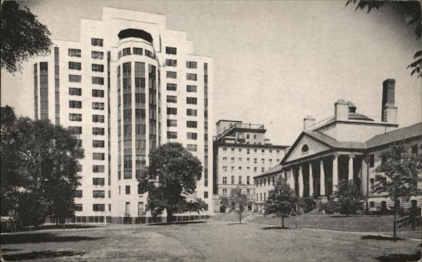 The old - Original Bulfinch Building, 1821, and the new - George Robert White Build- ing, 1939. Massachusetts General Hospital, Boston.