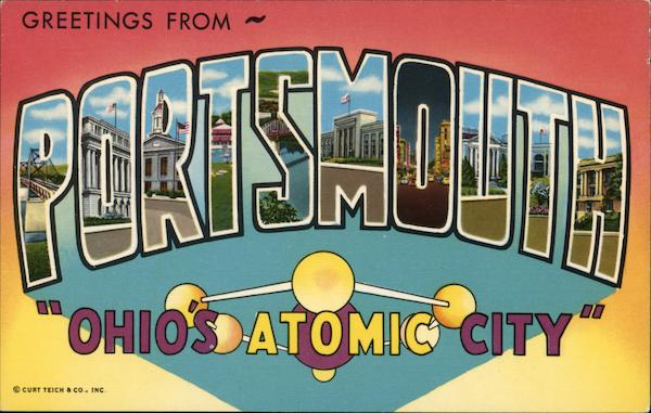 Front: GREETINGS FROM OHIOS ATOMIC CITY © CURT TEICH & CO., INC. Back: DISTRIBUTED BY PORTSMOUTH NEWS AGENCY, PORTSMOUTH, OH10 CURTEICHCOLOR® 3-D NATURAL COLOR REPRODUCTION (REG. U. S. A. PAT. OFF.) 4DK-1879
