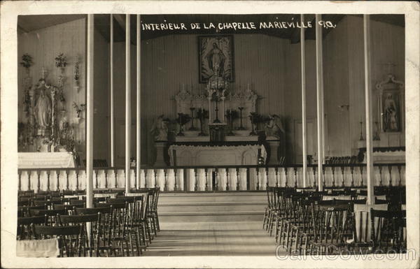 Front: INTERIEUR DE LA CHAPELLE MARIEVILLE TO, XX AU Back: MADE IN CANADA APL ST wish you could se this place this to rest H. F C. Your A. Vi 2200 Having a fine tine Mrs. E va Starkey 47 Harvest St Synn Maso
