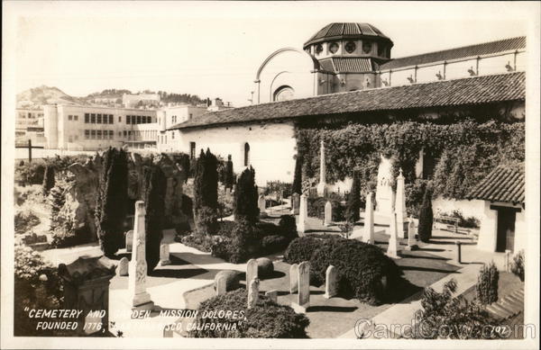 "CEMETERY AND GARDEN MISSION DOLORES FOUNDED 1776, SAN FRANG SCO, CALIFORNIA 107.