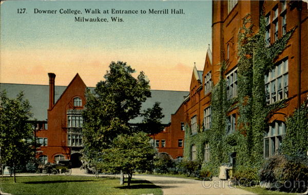 Front: 127. Downer College, Walk at Entrance to Merrill Hall, Milwaukee, Wis. Back: E. A. BISHOP, PUB., RACINE, WIS. MILWAUKEE MESSAGE MAY BE WRITTEN ON THIS SIDE. and Island Possessions Cuba, Canada and For Foreign. A-16309 750