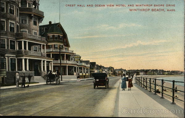 Front: CREST HALL AND OCEAN VIEW HOTEL AND WINTHROP SHORE DRIVE WINTHROP BEACH, MASS. CREST HALL 我 Back: Mason Bros. & Co., Boston, Mass. 1.- 4,50 }