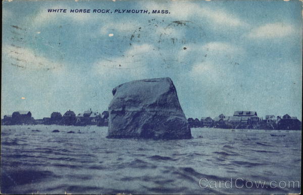 Front: WHITE HORSE ROCK, PLYMOUTH, MASS. Back: PUB. BY A. S. BURBANK Bey CA 35 AUG 9 9-30A MASS & bevescent Hause Greetings from Miss Mr. & Nichols. White House beach 21 Wilcoy St. Springfield. Mass.