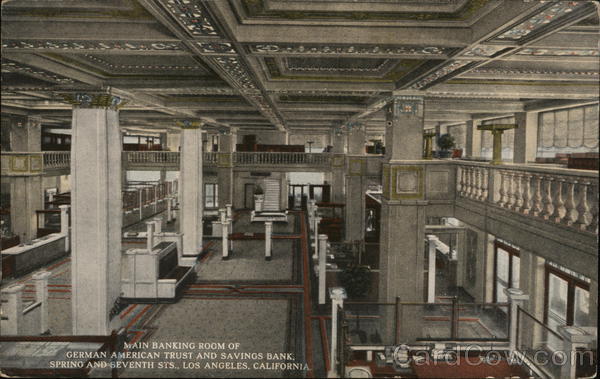 Front: MAIN BANKING ROOM OF GERMAN AMERICAN TRUST AND SAVINGS BANK, SPRING AND SEVENTH STS., LOS ANGELES, CALIFORNIA, 1910 Back: 178 R-52018 C.T. PHOTOCHROM 06 UM THIS SPACE FOR ADDRESS ONLY