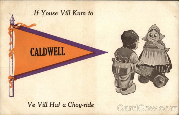 Front: If Youse Vill Kum to CALDWELL Ve Vill Haf a Choy-ride Back: white? or once in a old dout Hell aya. Jay. po und a (s DWELL POST CARD2 jot FOR ADDRESS ONI spe KA raz Ma Floyd Hollur sworth 316 M. J. SA., Wellington, Bons.