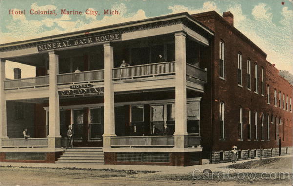 Front: Hotel Colonial, Marine City, Mich. MINERAL BATH HOUSE COLONIAL 1111 HILL Back: 17933 Domestic and Two Cents