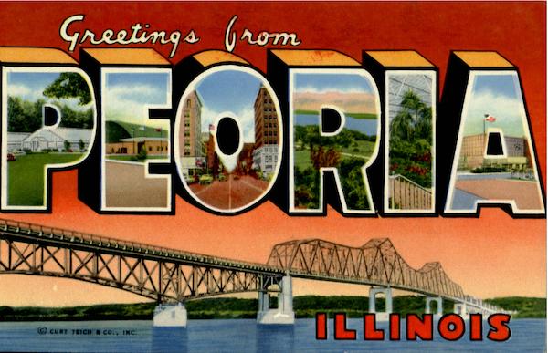 P - Glen Oak Park Conservatory - Exterior. E - Bradley University's Fieldhouse. O - Adams Street. R - Upper Peoria Lake. I - Glen Oak Park Conservatory - Interior A - Caterpillar Tractor Co., building.