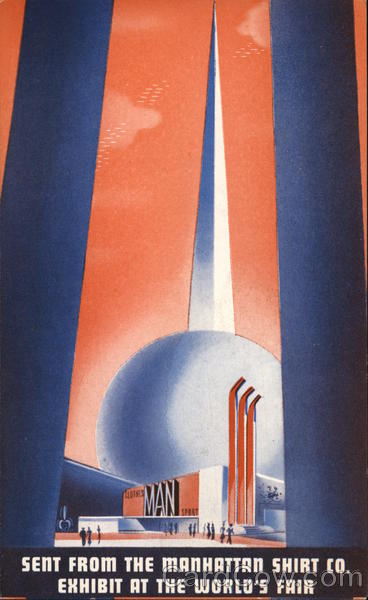 Front: MAN LLOTHES SENT FROM THE MANHATTAN SHIRT CO. EXHIBIT AT THE WORLD'S FAIR Back: Manhattan SHIRT CO. creators of the Shirts of Today welcome you to the World of Tomorrow HERE