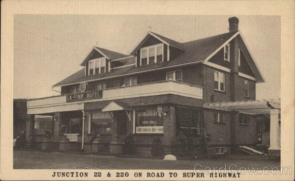 Front: IFC LA-FINK HOTEL SODA GRILL Hille 1. GREYHOUND BUS STOR JUNCTION 22 & 220 ON ROAD TO SUPER HIGHWAY Back: NATIONAL PRESS CHICAGO 1c IN U. S. A.