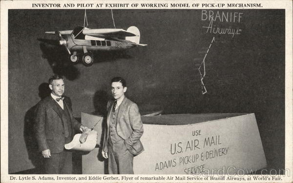 Dr. Lytle S. Adams, Inventor, and Eddie Gerber, Flyer of remarkable Air Mail Service of Braniff Airways, at World's Fair.
