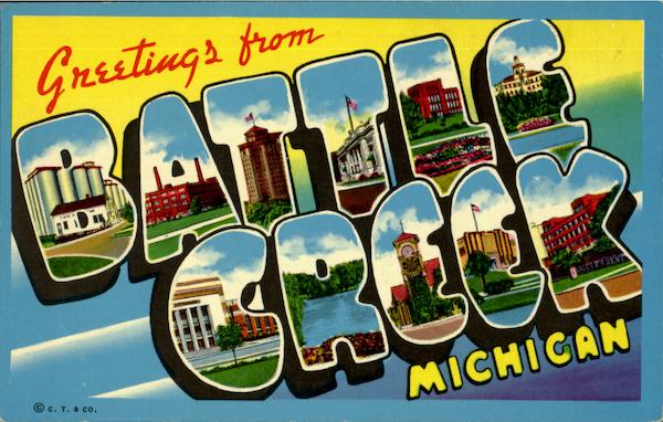 | B - The "Birthplace" of Post Products. A - Plant of the Kellogg Company. T - A View of Battle Creek Sanitarium. T - Post Office. L - Southeastern Junior High School. E - Community Hospital. C - W. k. Kellogg Auditorium & Jun. High School R - A lagoon in Irving Park. E - First Methodist Church. E - Boy's Club. K - A Portion of the Plant of past Products. |