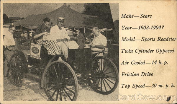 Front: 1600 Make-Sears Year-1903-1904? Model-Sports Roadster Twin Cylinder Opposed Air Cooled-14 h. p. Friction Drive Top Speed-30 m. p. h. Back: 3.00 FEED FELCO FEED MADE BY YOUR COOPERATIVE STAMP