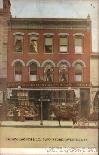 Front: ان المدن FLOFCOEFLON LOD F.W.WDOLWORTH & CO.5 AND 10 CENT STORE 2010 PR F.W.WOOLWORTH & CO. 5 &104 STORE, DAVENPORT, IA. Back: MESSAGE CAN BE WRITTEN ON THIS SIDE 158 @5232 ROCK ISLAND POST CARD CO. ROCK ISLAND ILL. HERE