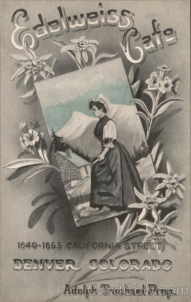 Front: Edelweiss Yo Cafe 1649-1655 CALIFORNIA STREET DENVER COLORADO Adolph Trachsel Prop. Back: THE SMITH-BROOKS PRESS, DENVER THIS SPACE CAN BE USED FOR A WRITTEN MESSAGE. TWO CENTS