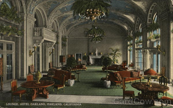 Front: LOUNGE, HOTEL OAKLAND, OAKLAND, CALIFORNIA. Back: MADE IN U. S. A PUBLISHED BY SMITH BROS., 470-474 13TH ST., OAKLAND, CAL. DIRECT FERRY TO EXPOSITION GROUNDS Foo CHICAGE R-39859 T. PHOTOCHROM. وري 1.50 THIS SPACE FOR ADDRESS ONLY.