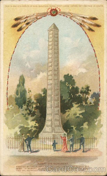 Front: 1000 810 SLEEPY EYE MONUMENT. ERECTED BY THE SLEEPY EYE MILLING COMPANY AT SLEEPY EYE, MINNS IN MEMORY OF OLD SLEEPY EYE, WHOSE STERLING QUALL TIES ARE REPRESENTED IN THE FLOUR THAT BEARS HIS NAME WILMANNS BRO'S CO. MILWAUKEE Back: TWO CENTS.