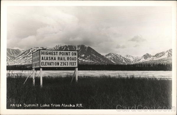 Front: E HIGHEST POINT ON SARL ON ALASKA RAIL ROAD FELEVATION 2363 FEET AR-124 Summit Lake from Alaska R.R. Back: 50 EK 1,5 Ate 30's Ahern 485 C-19405